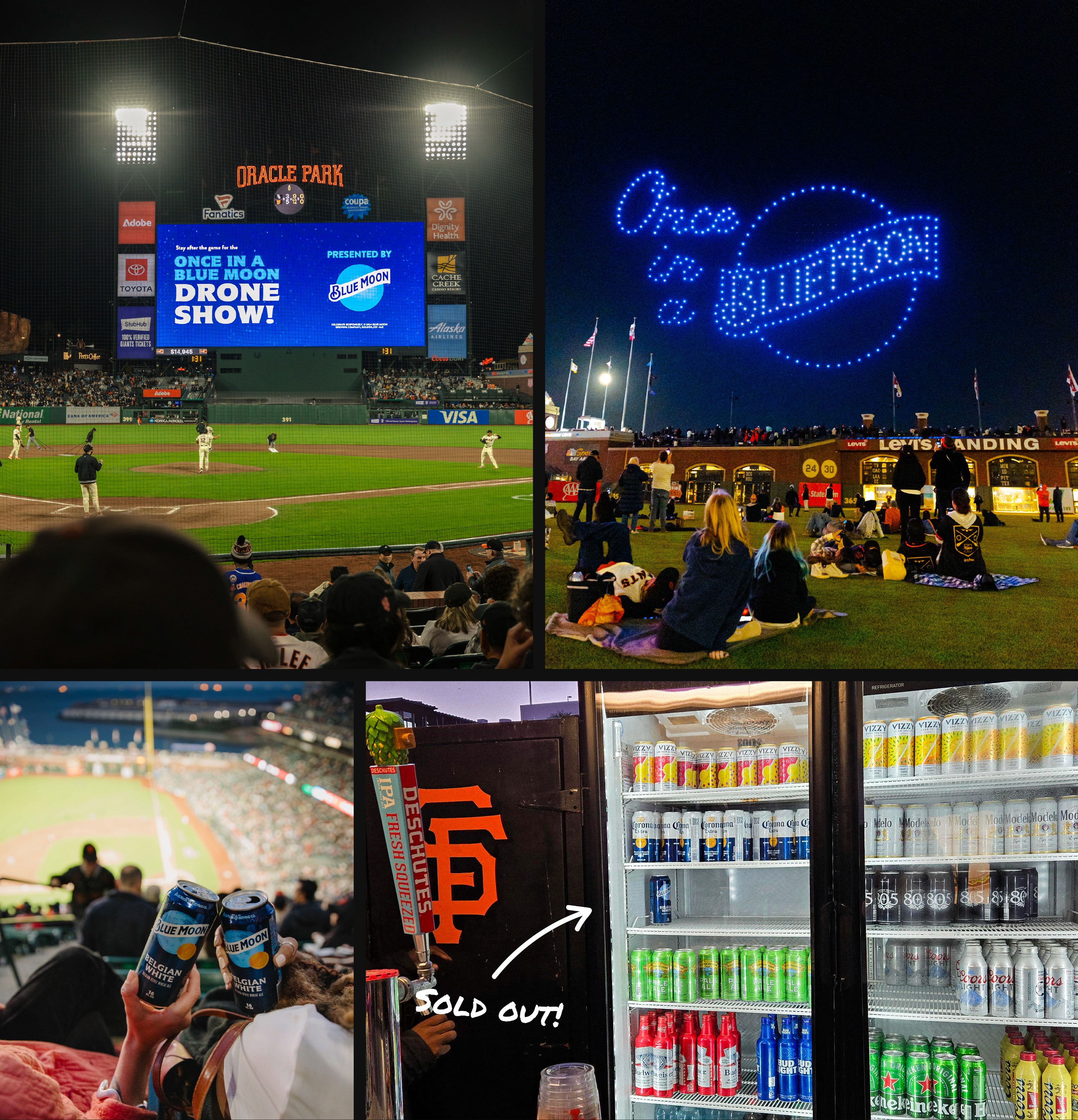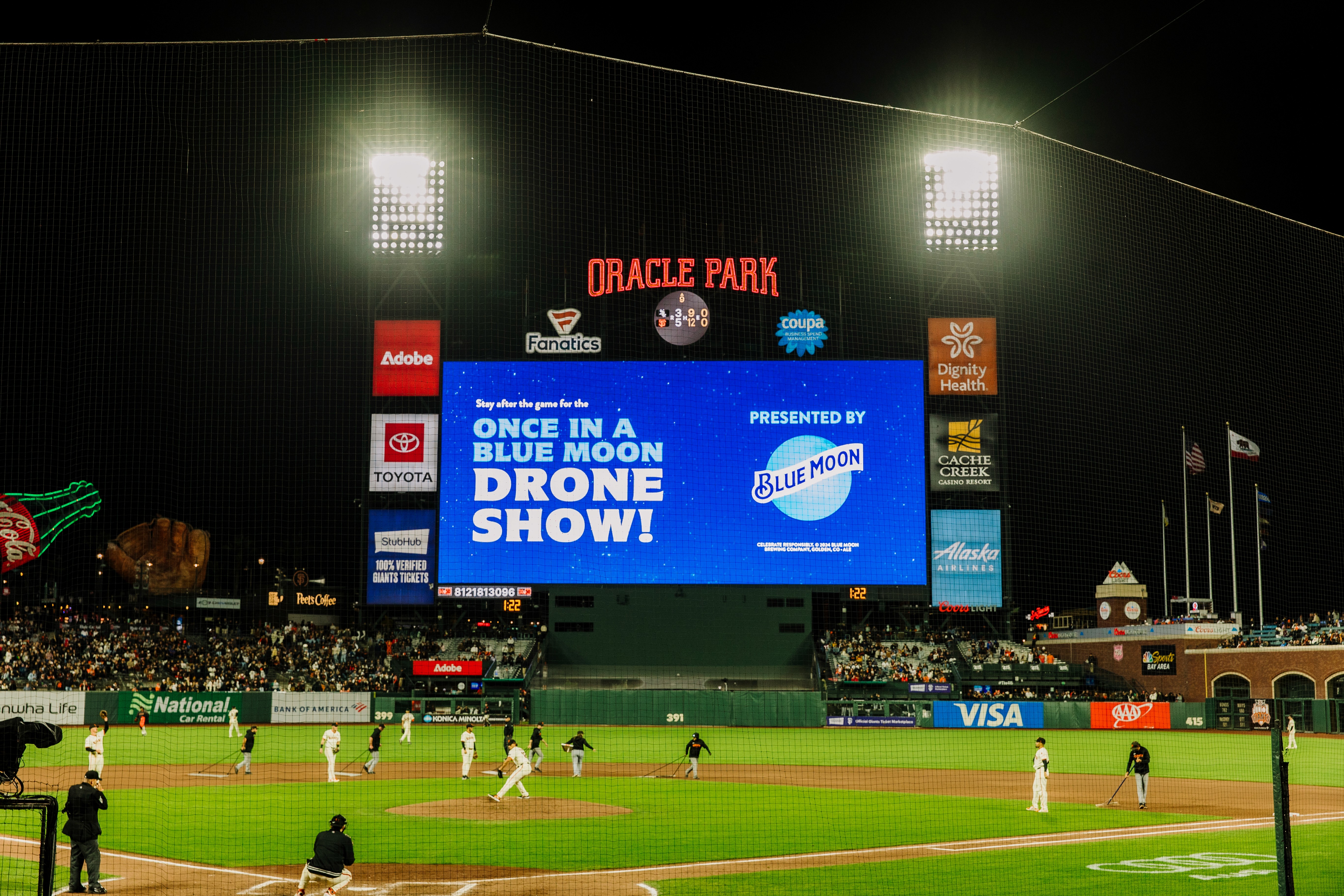 On August 19th, 2024, a real Blue Moon (and a supermoon!) was set to rise over San Francisco. And as a brand named after the rare event itself, we couldn’t just watch from the sidelines. After the Giants game at Oracle Park, we launched hundreds of drones to meet it in the sky, precisely aligning the Blue Moon logo with the real moon.
