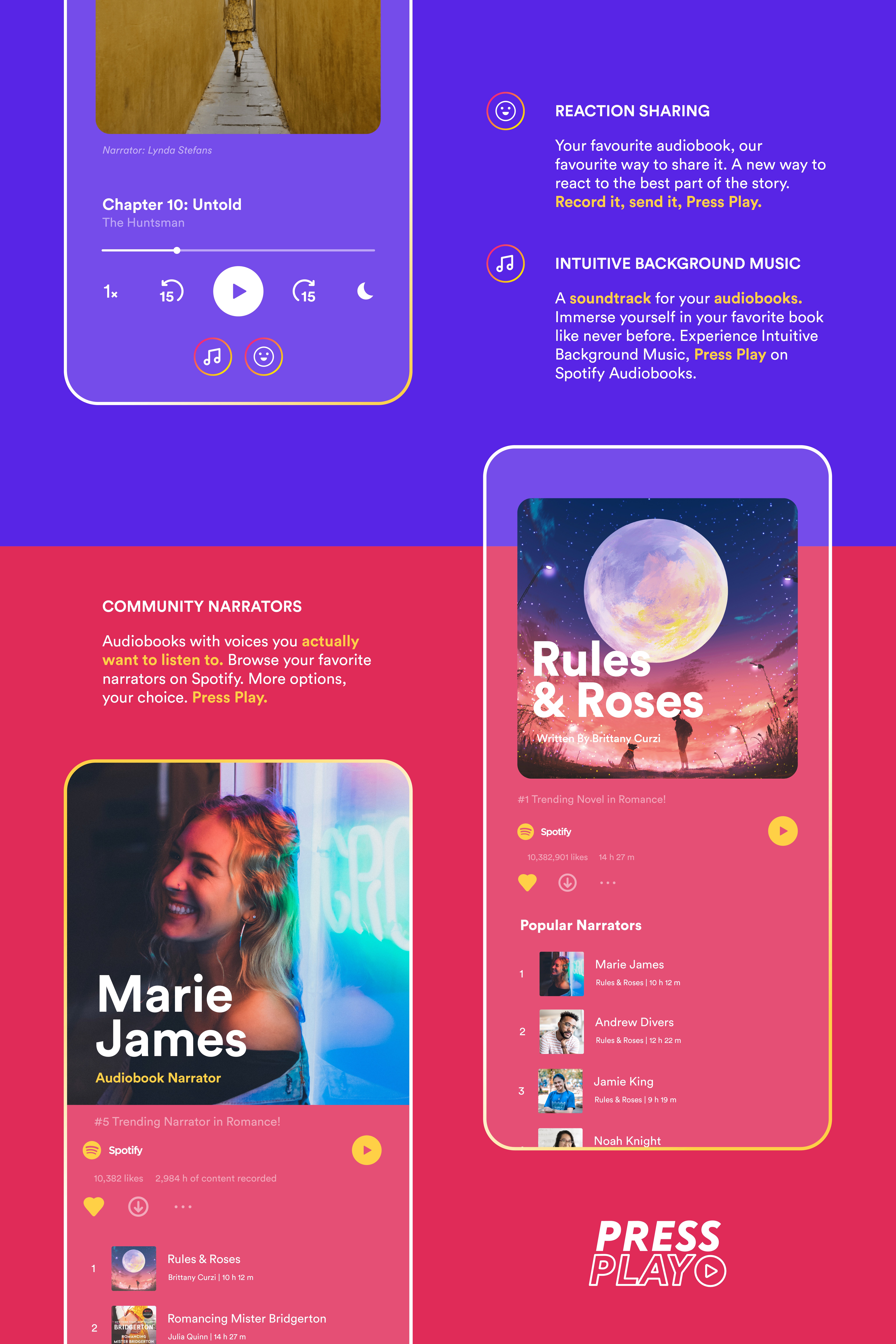Gen Z already lives on Spotify, but mostly for music. Our challenge was to introduce Spotify Audiobooks in a way that felt native to their behavior. Press Play did exactly that—reimagining what an audiobook could be for a generation that experiences stories through community, creativity, and shared moments.